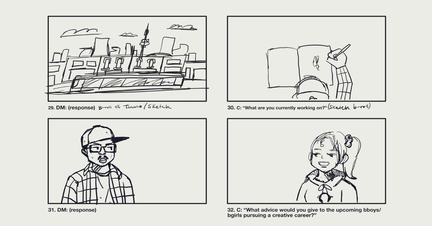 During storyboarding, we identified our key visual elements: archival footage from the breaking scene, Mike's artwork evolution, and intimate b-roll of him drawing. The story would be told through these layers, building a complete picture of the artist's journey.